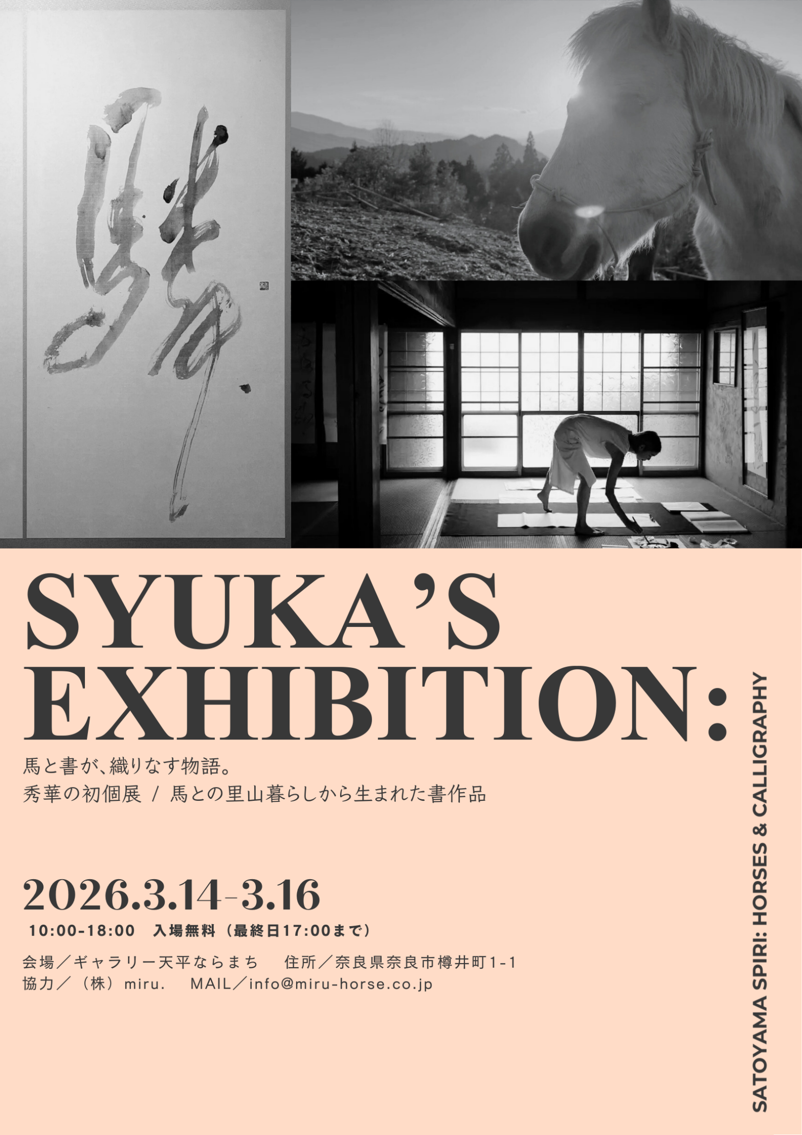 【SYUKA'S EXHIBITION: 馬と書が織りなす物語。】miru.代表 秀華の初個展を開催します。 日程(時間) 2026年3月14日(土)〜3月16日(月) 10:00〜18:00(※最終日は1…